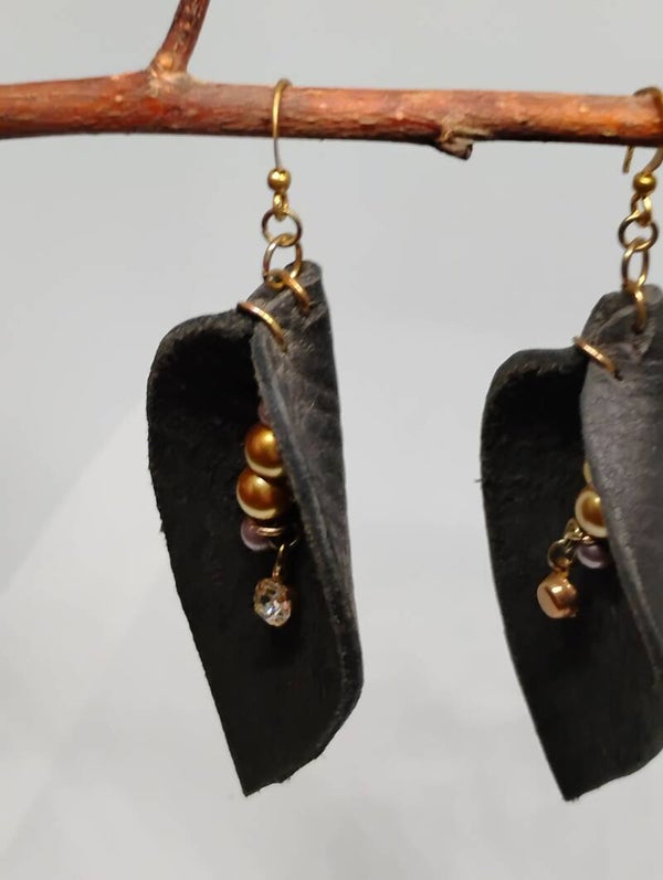Hand made and crafted from 100% Raw Cow Hide Leather. The earring wires are 100% Sterling Silver and made with real Freshwater purple pearls an Australian Crystal at the end.