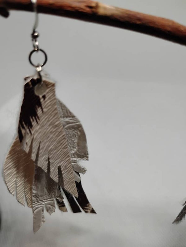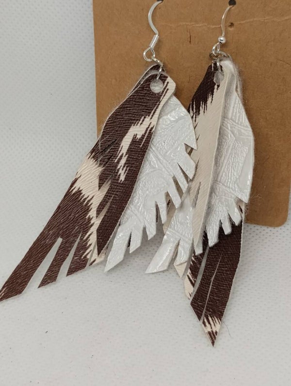 Hand made & cut pleather earrings in a fringed wing look and are tripled layered. Earrings are on a Sterling Silver French Ear Wire.